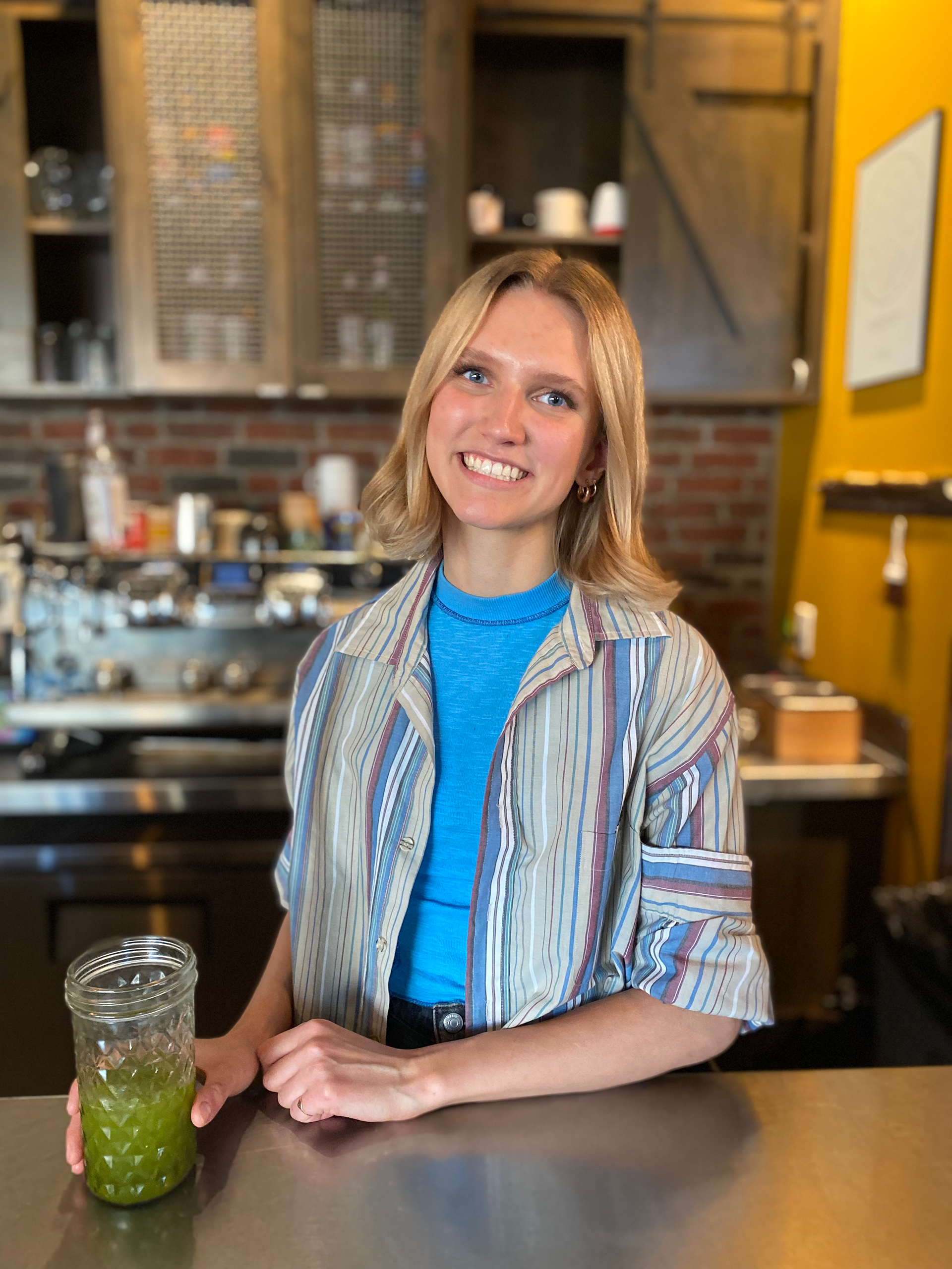 my april 2022 employee of the month headshot, blueberry matcha lemonade included!