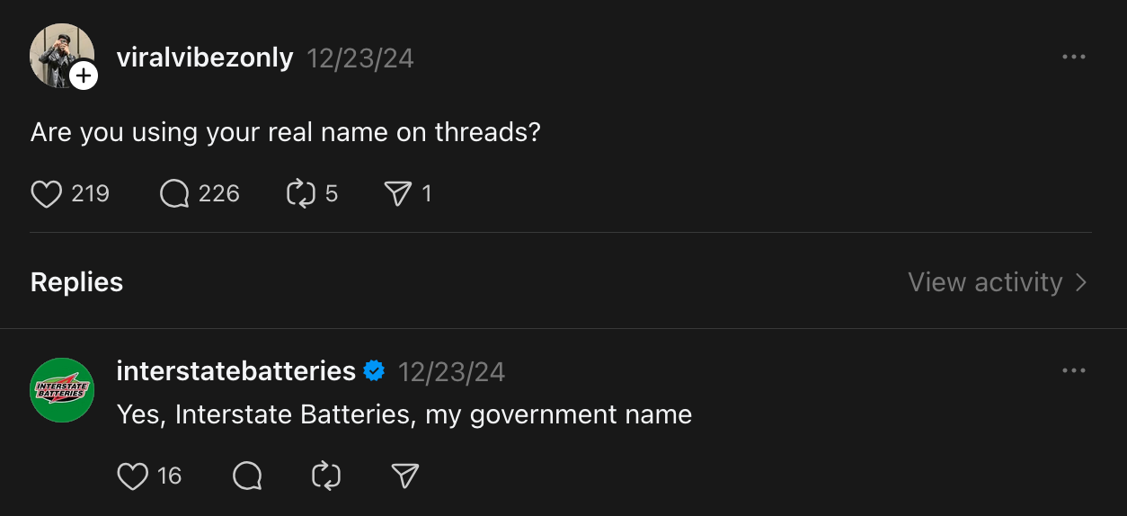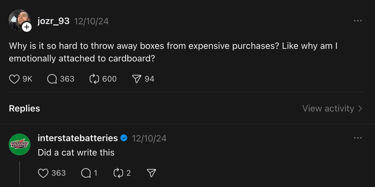 A large part of my role in cultivating communities involves supervising, moderating, and cultivating conversations on brand accounts on platforms such as Instagram, Facebook, TikTok, X, Threads, YouTube Shorts, and BlueSky. I craft witty and concise comments on new posts, positioning the brand right in the audience's view as they scroll the comments. Targeted outreaches positively impact brand awareness and relevance, humanizing a brand and making it more accessible to an audience. At my core, I'm a writer. I love captioning and proofing written content for Interstate Batteries. With a unique and fresh brand voice, composing text posts and doing cross-platform comment outreach is such a fun way to express my creativity and attention to what's trending.